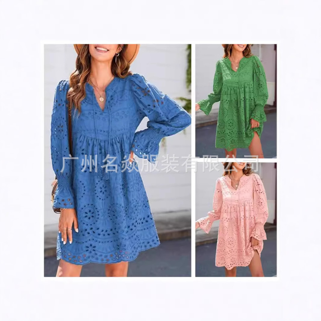 Perdagangan Luar Negeri Luar Negeri 2024 Eropa dan Amerika Model Musim Semi dan Musim Panas Wanita Populer Amazon Leher Bulat Leher Putih Berongga Gaun Longgar Batch