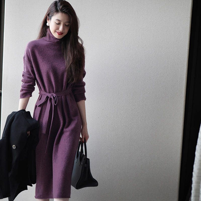 Gaun sweter rajut gaya Korea, gaun turtleneck warna polos, baru musim gugur dan musim dingin 2024, bertali semua cocok