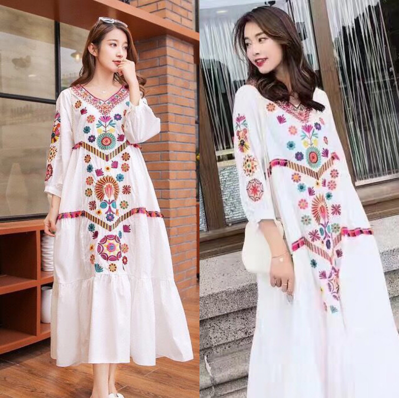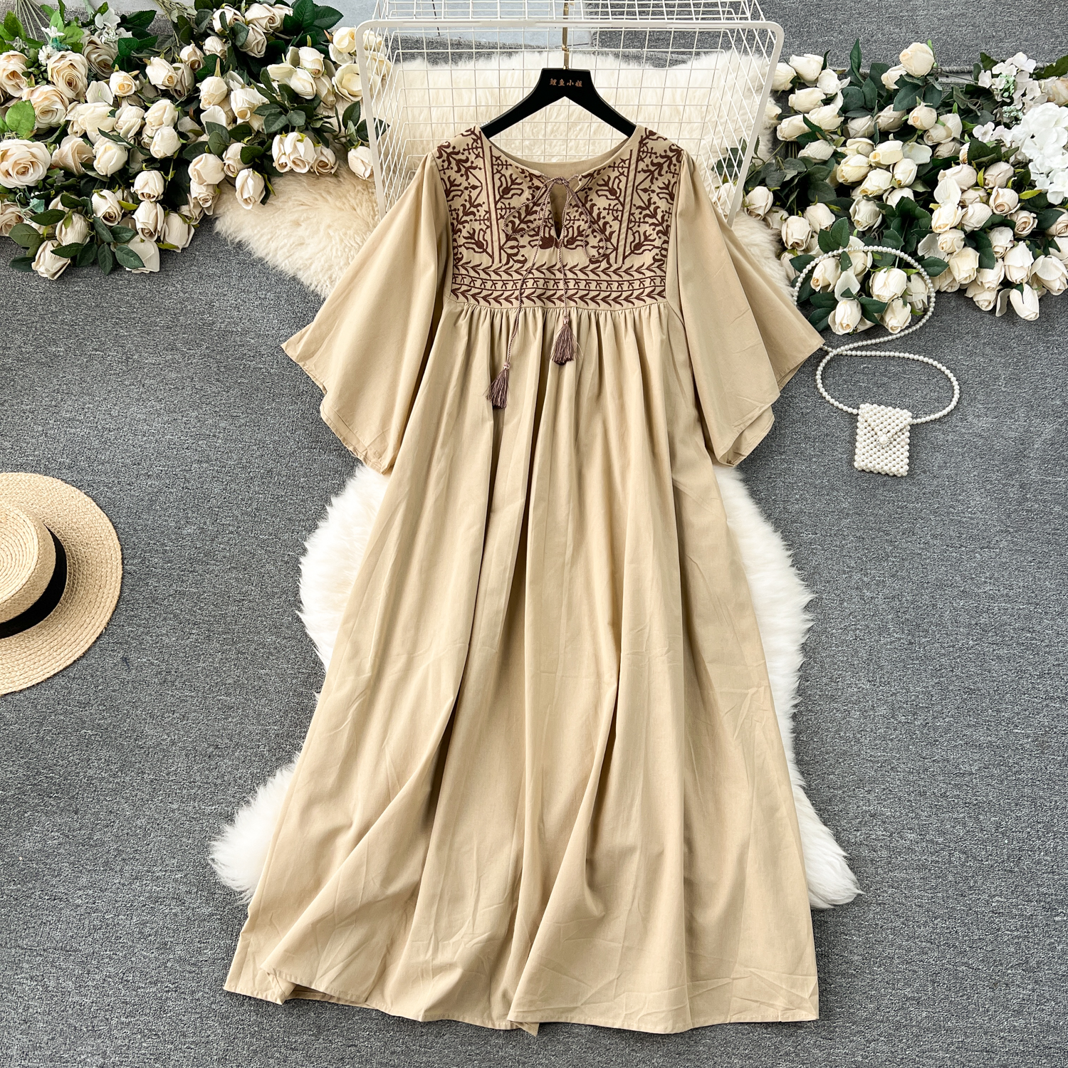 Gaun liburan ukuran besar wanita, gaun liburan pelangsing penutup perut longgar panjang bordir Berat retro baru musim semi 2024