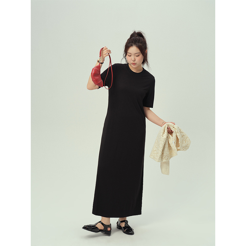 Pakaian Wanita Ukuran Besar Gaun Terlihat Langsing Usia Muda Modis Model Baru Musim Panas T-shirt Wanita Lengan Pendek Rok Panjang Kasual Terlihat Langsing Warna Hitam