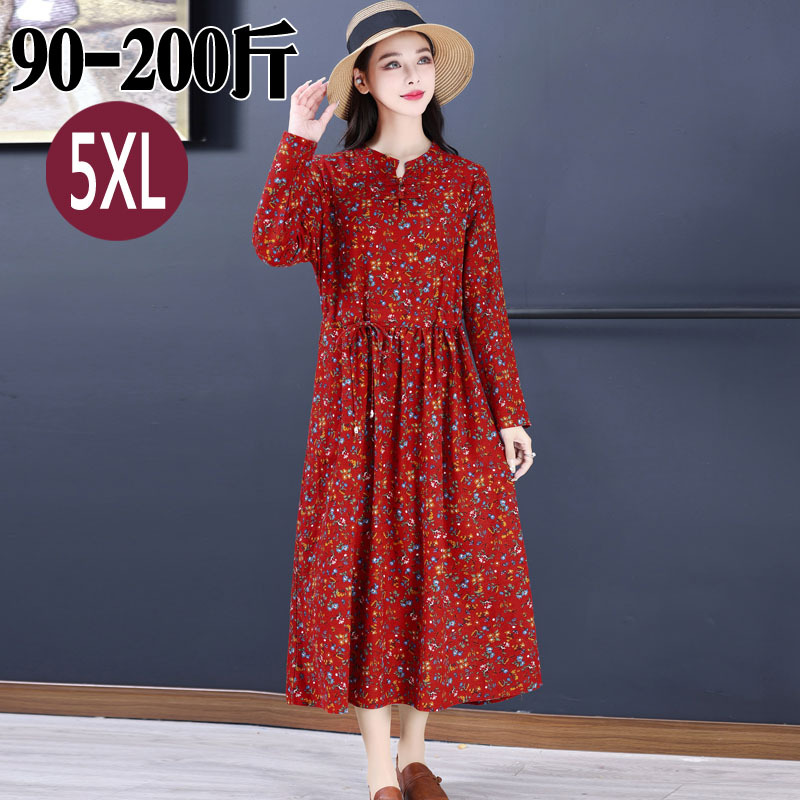 Gaya baru musim gugur dan musim dingin, pakaian wanita ukuran besar, gadis gemuk, usia menengah, pelangsing, renda, bunga, gaun lengan panjang, awal musim gugur