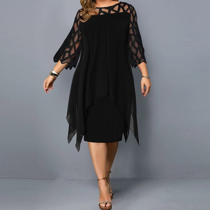 Amazon AliExpress gaun sifon lengan tujuh titik, rok sifon tidak rata jahitan renda wanita ukuran besar Eropa dan Amerika