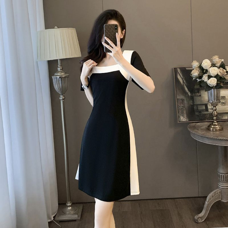 Gaun Niche Desain Hitam Putih Gaya Perancis Ukuran Besar Rok Terlihat Langsing Kerah Persegi Elegan Model Baru Musim Panas