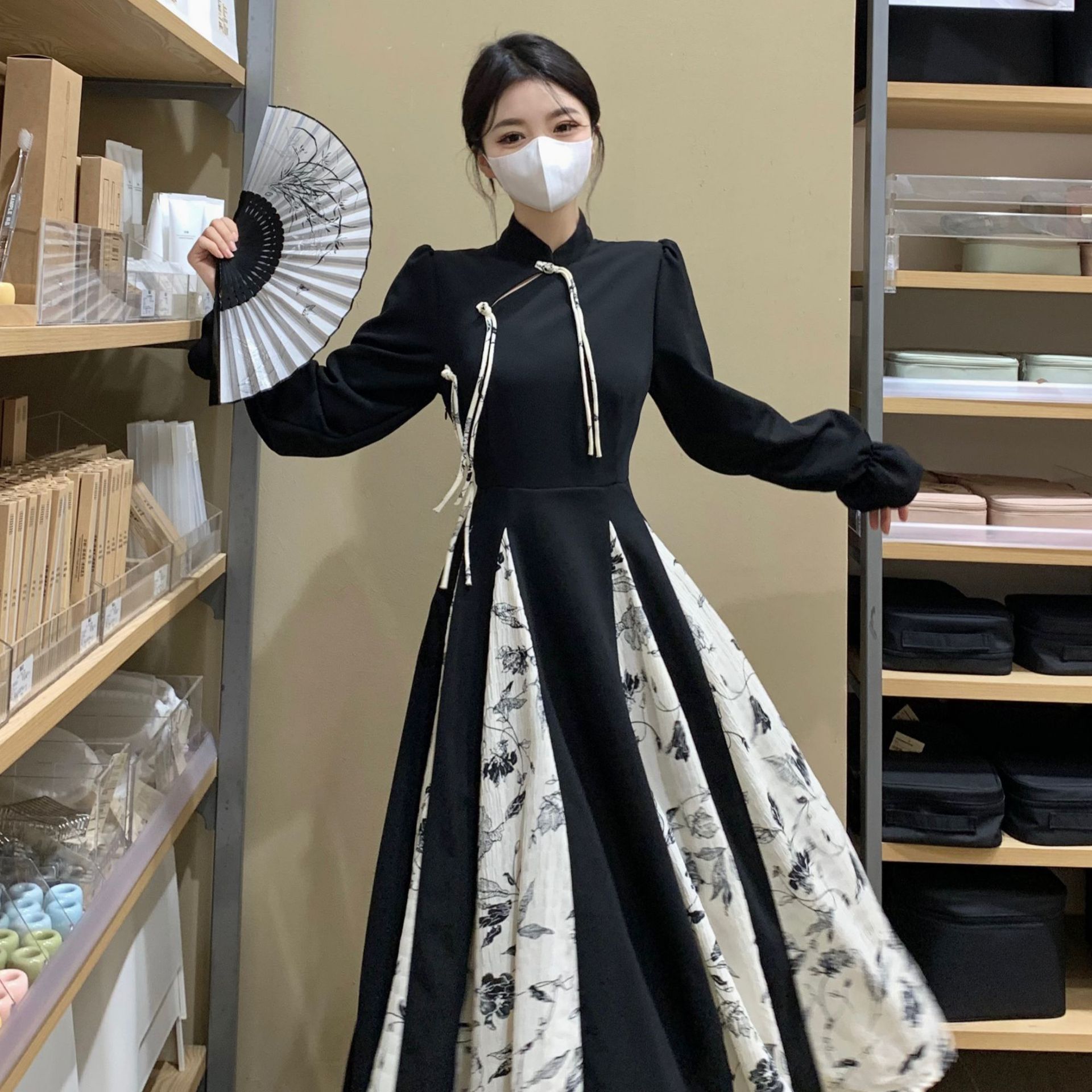 Jatuh 2023 ukuran besar pakaian wanita baru gaya Cina retro ditingkatkan cheongsam bunga jahitan Hepburn gaya gaun wanita