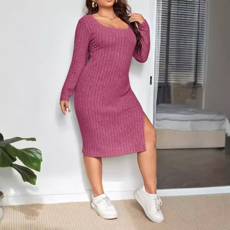 Gaun rajut rib lengan panjang model bodycon slim-fit dengan belahan, ukuran besar, untuk wanita, musim gugur dan musim dingin 2024, impor dari Eropa dan Amerika.