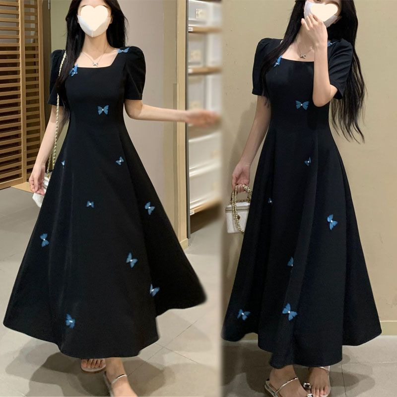 Gaun Gaya Chanel Elegan Kerah Persegi Ukuran Besar Wanita Gemuk Rok Hitam Kecil Bergaya Senior Gaya Prancis Model Baru Musim Panas Wanita