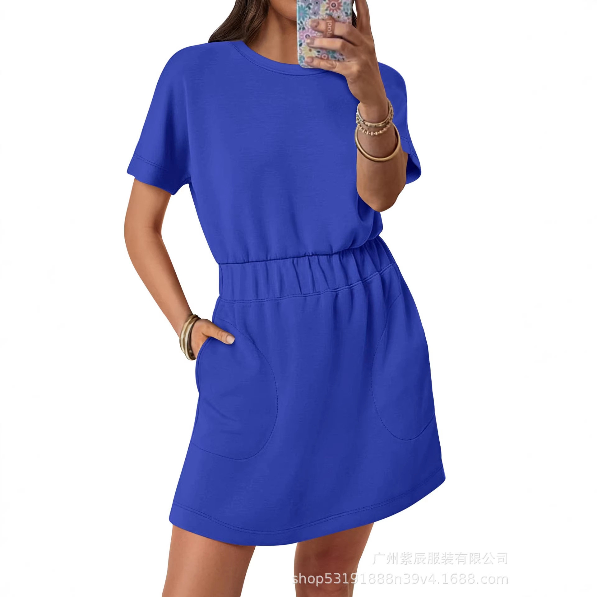 Pakaian Wanita Perdagangan Luar Negeri Luar Negeri 2025 Gaun T-shirt Lengan Pendek Ketat Pinggang Pinggang Tinggi Pullover Warna Polos Saku Lengan Bahu
