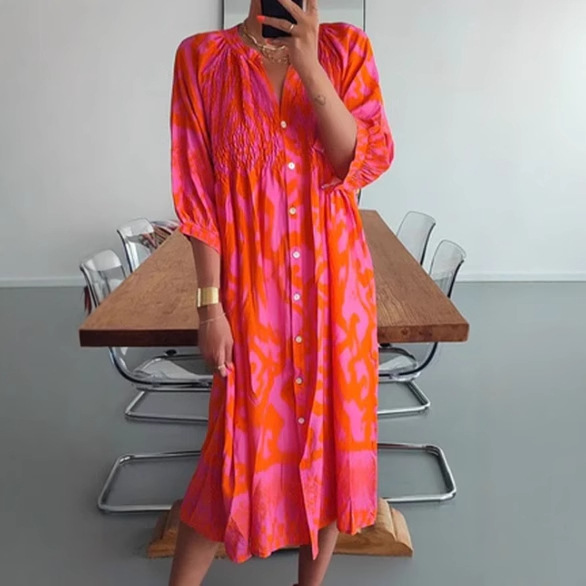 Pakaian Wanita Eropa dan Amerika 2025 Gaun Longgar Kancing Kancing Motif Cetak Digital Stasiun Independen Amazon Gaun Panjang
