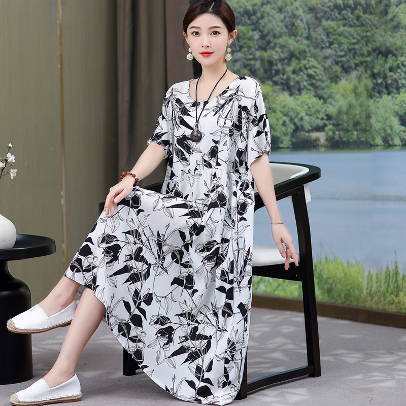 Gaun katun sutra musim panas 2024, pakaian wanita paruh baya dan lansia longgar ukuran besar katun buatan lengan pendek penutup perut rok ibu