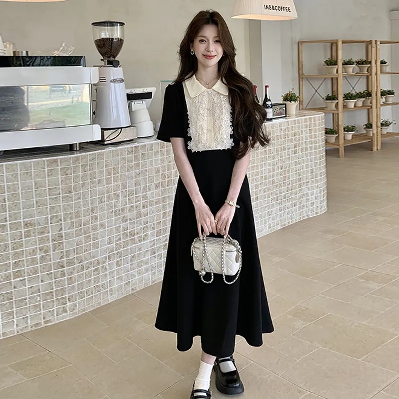 韩版大码女装胖mm黑色连衣裙女夏季法式蕾丝娃娃领收腰显瘦小黑裙