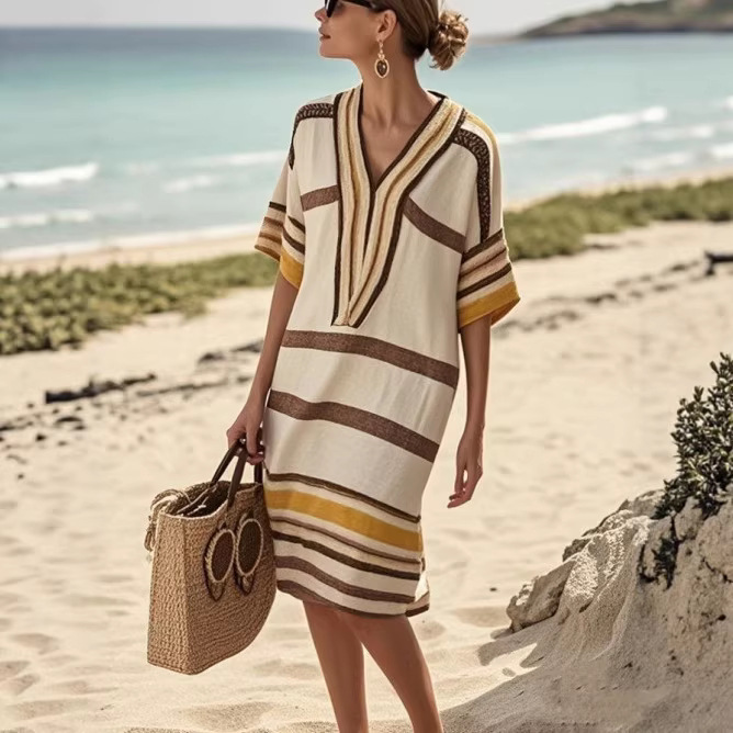 Pakaian Wanita Crossborder Model Baru Musim Panas 2025 Eropa Amerika Rok Panjang Longgar Elegan Modis Gaun Kasual Bergaris