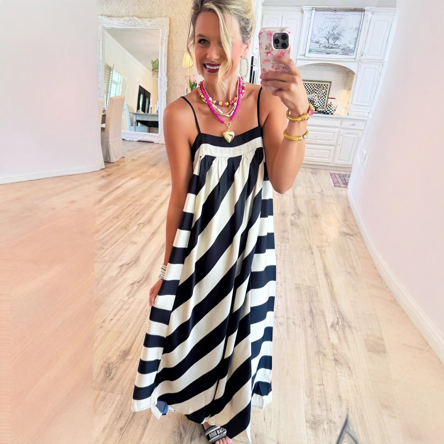 Pakaian Wanita Crossborder Eropa dan Amerika 2025 Gaun Longgar Tali Punggung Terbuka Besar Seksi Modis Garis Hitam Putih Musim Panas
