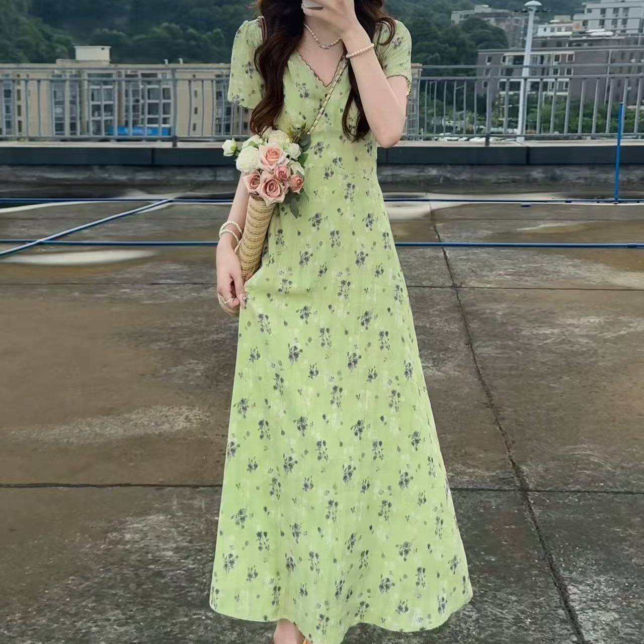大码胖mm气质V领碎花泡泡袖连衣裙女夏季新款收腰显瘦a字长裙跨境