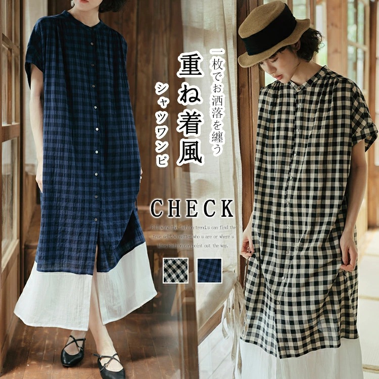 Gaun Katun Linen Kombinasi Kerah Bulat Kotak-Kotak Ukuran Besar Model Baru Jepang Korea Musim Panas Rok Panjang Wanita Musim Semi dan Musim Panas Kasual Gaya Jepang