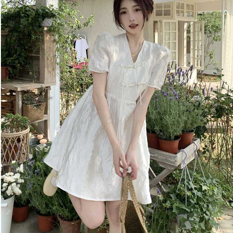Rok Pendek Warna Putih Lengan Busa Model Baru Musim Panas Gaun Kancing Kancing Gaya Nasional Terlihat Ramping Menutupi Kakak Perempuan Gemuk Ukuran Besar Wanita