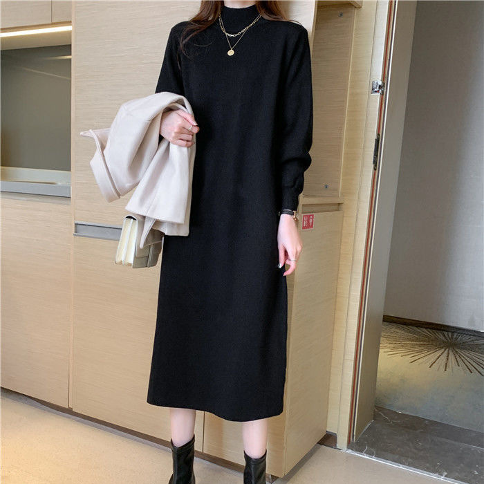 Gaun Sweater Dalaman Model Musim Gugur dan Musim Dingin Ukuran Besar Gaun Rajutan Ditambah Tebal Ekstra Bulu Kerah Setengah Tinggi Longgar Model Baru 2025 Wanita Trendi