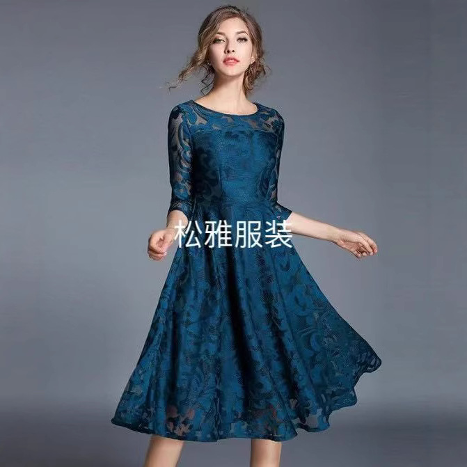 Gaun musim semi dan musim gugur lintas batas pakaian wanita ukuran besar Eropa dan Amerika pakaian wanita lengan tiga perempat ramping panjang renda gaun ayun besar