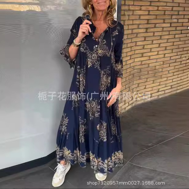 Gaun ayun lengan panjang wanita, gaun ayun lintas batas Eropa dan Amerika bergaya bohemian populer berkancing leher V