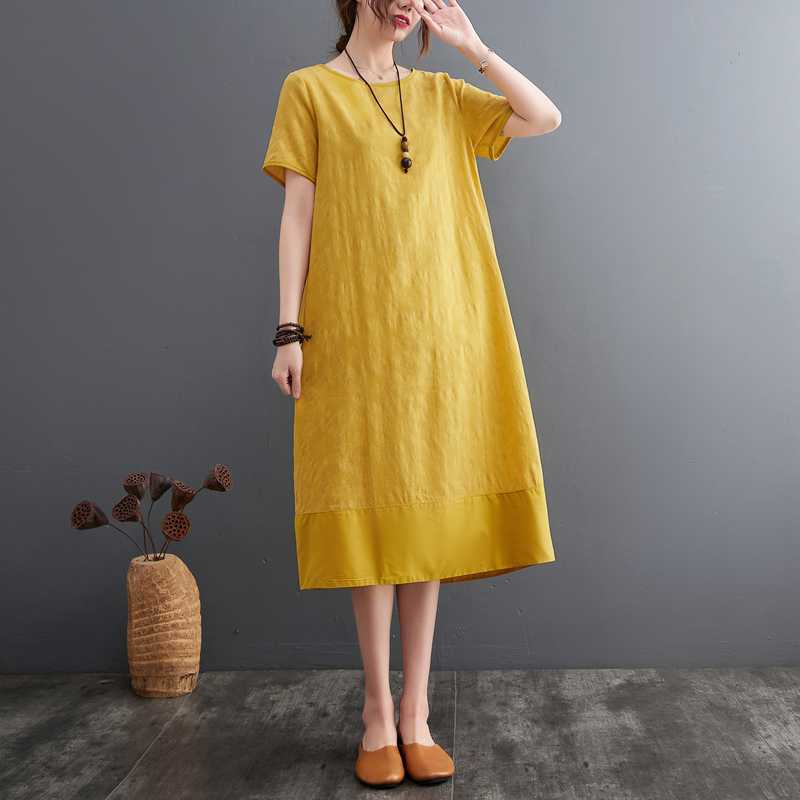 4 warna dalam ~ tambahkan biru dongker 2024 musim panas warna solid leher bulat artistik katun dan linen longgar berlipat gaun lengan pendek