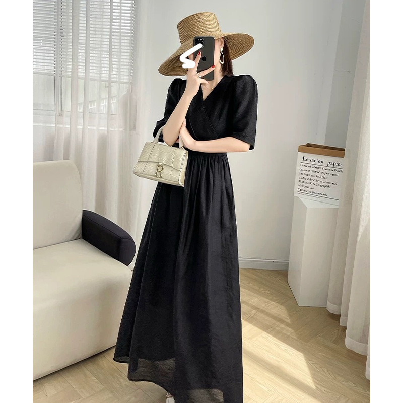 Pakaian Wanita Ukuran Besar Model Baru Musim Panas 2025 Gaun Hitam Membentuk Pinggang Modis Mudah Dipadu Padan Rok Panjang Di Bawah Lutut Kerah V Terlihat Langsing