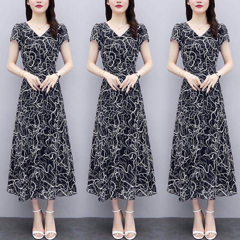 Gaun bunga wanita paruh baya dan lansia, gaun lengan pendek pemurang usia, temperamen pelangsing pinggang ukuran besar Motif bunga musim panas 2021