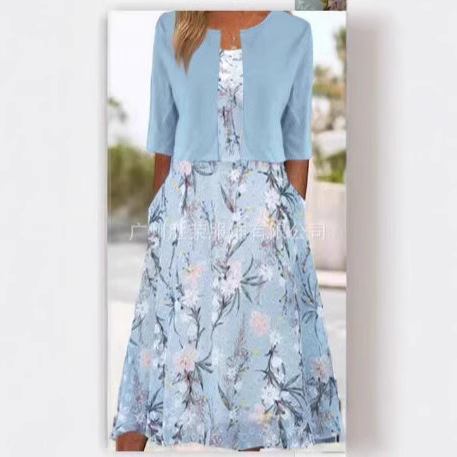 Gaun kasual wanita musim panas Amazon Eropa dan Amerika 2024 dua potong gaun ramping leher bulat motif bunga untuk wanita