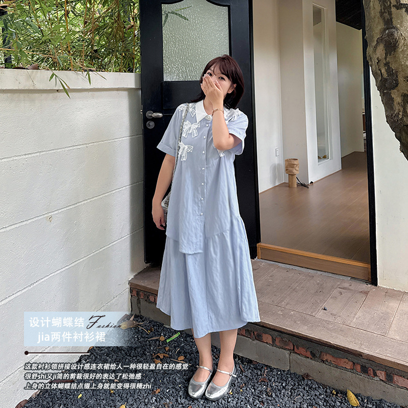 Gaun Musim Panas Ukuran Besar Dua Hari Rok Kemeja Pita Kupu-Kupu Gaya Desain Ukuran Besar 200Kg untuk Adik Perempuan Gemuk 9025