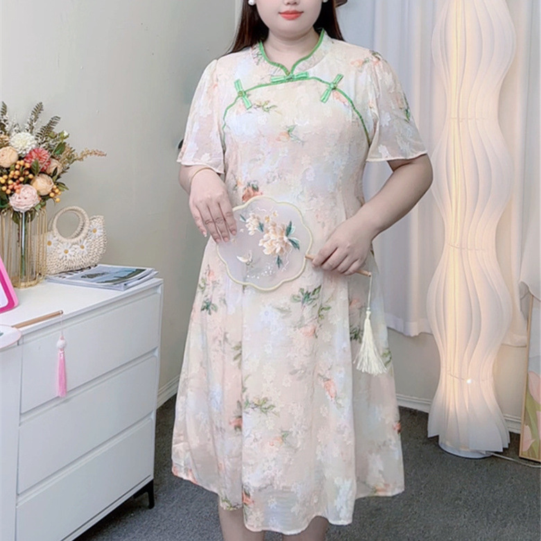 Gaun Bertabur Bunga Sifon Mengurangi Usia Elegan Ukuran Besar Model Baru Musim Panas 2025 Rok Panjang Menutupi Perut Terlihat Langsing Pinggang Lemak Wanita