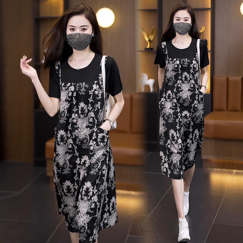 Gaun wanita musim panas, baju wanita selutut panjang sedang longgar ukuran plus, baju gaya barat Semua cocok
