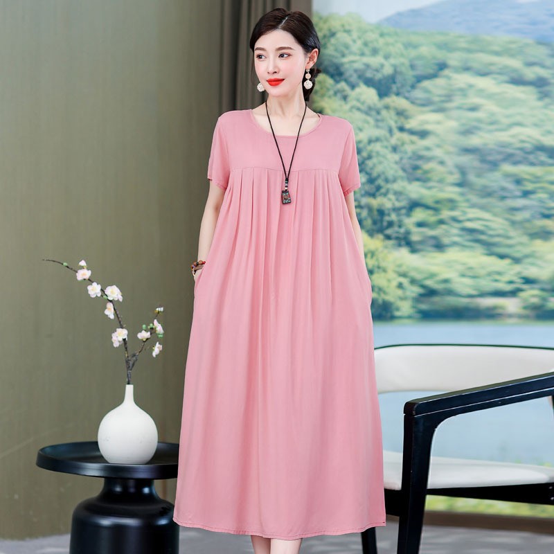 Gaun ukuran besar wanita, pakaian wanita ringan warna solid pelangsing leher bulat longgar JR326 musim panas dan semi 2024