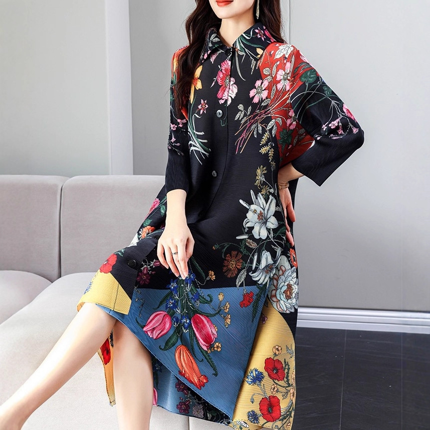 Gaun ayun atas lutut, pakaian wanita ukuran besar longgar artistik baru Musim Panas 2024