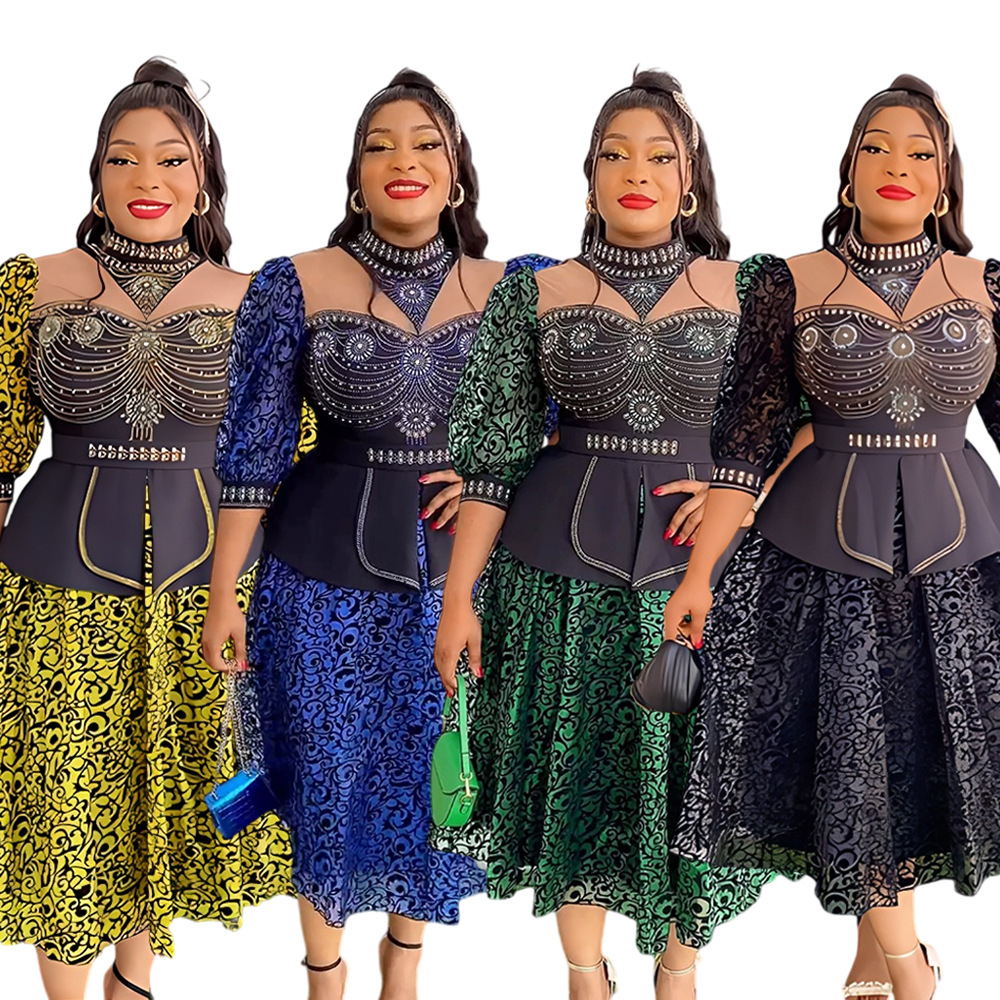 Gaun wanita perdagangan luar negeri lintas batas Eropa dan Amerika ukuran besar AliExpress Afrika berlian imitasi panas busa manik-manik pinggang pelangsing gaun jahitan renda