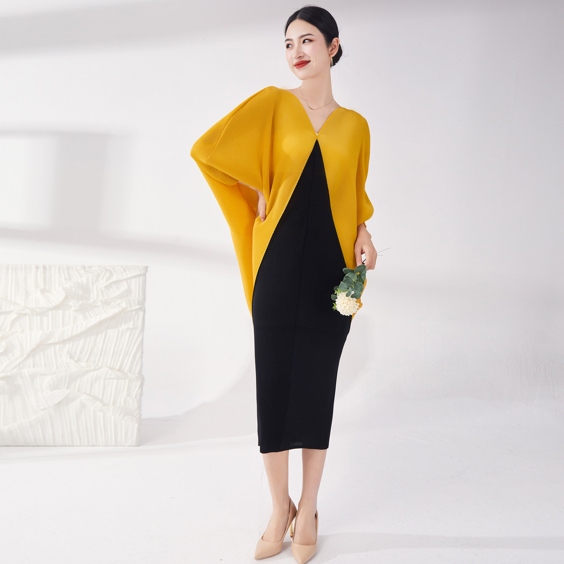 Gaun ukuran besar modis elegan plus gaun lipit longgar lengan kelelawar warna kontras jahitan lurus Sanzhai gaun elegan