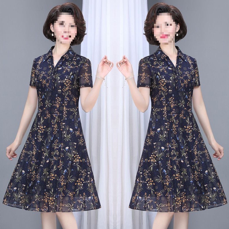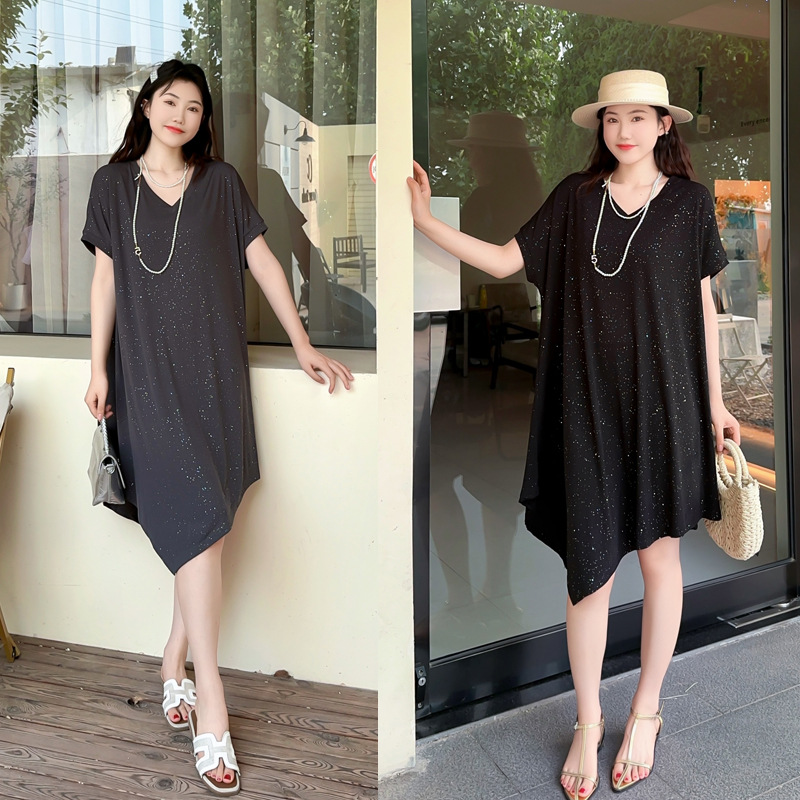 Gaun Lengan Pendek Kerah POLO Tipe Panjang Sedang Terlihat Langsing Menutupi Daging Ukuran Besar Model Baru Musim Panas Wanita Gemuk 200Kg 6884