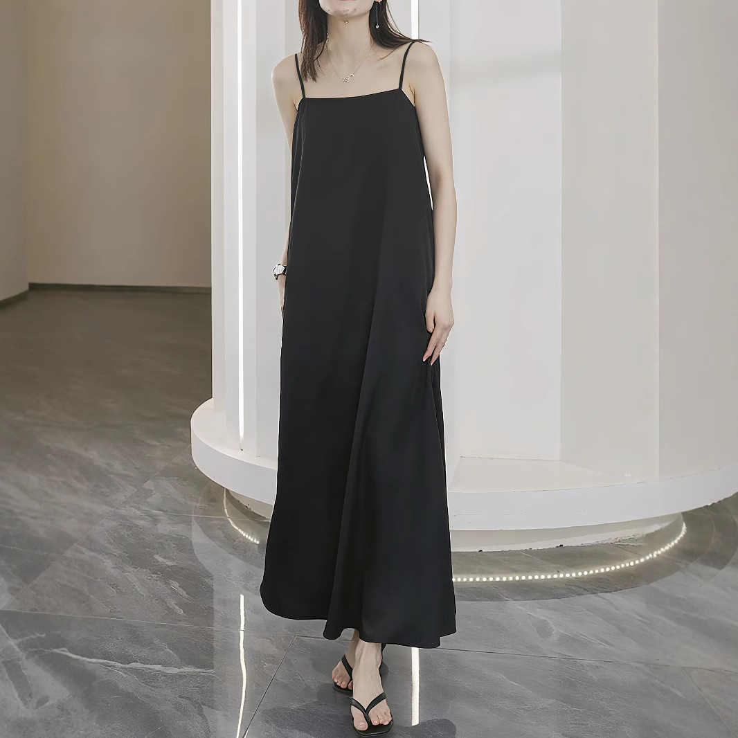 Q192-Pakaian Wanita Ukuran Besar Rok Pantai Terlihat Langsing Musim Semi Musim Panas Gaun Tali Panjang A-Line Satin Warna Polos MM