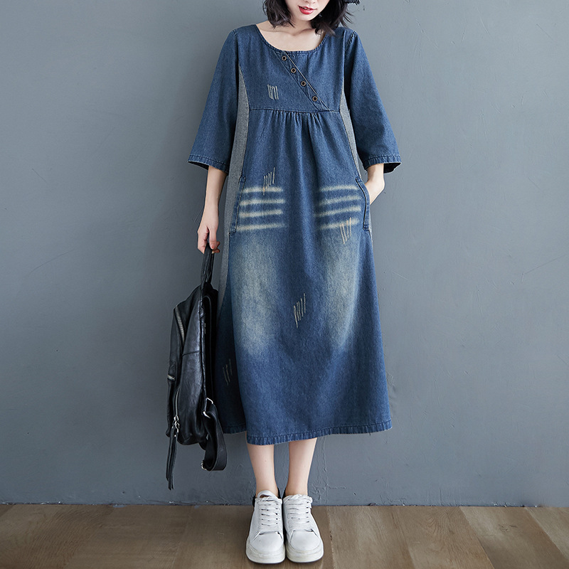 Gaun Denim retro pengurang usia wanita, pakaian longgar selutut, menutupi daging temperamen warna yang cocok Musim Semi dan Musim Gugur