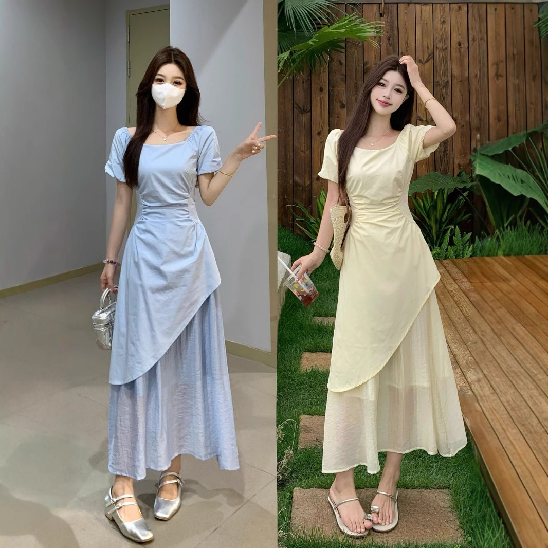 Gaun Lengan Busa Kerah Persegi Tidak Beraturan Gaya Desain Elegan Prancis Ukuran Besar Rok Panjang Lipit Pinggang Ketat Musim Panas Wanita