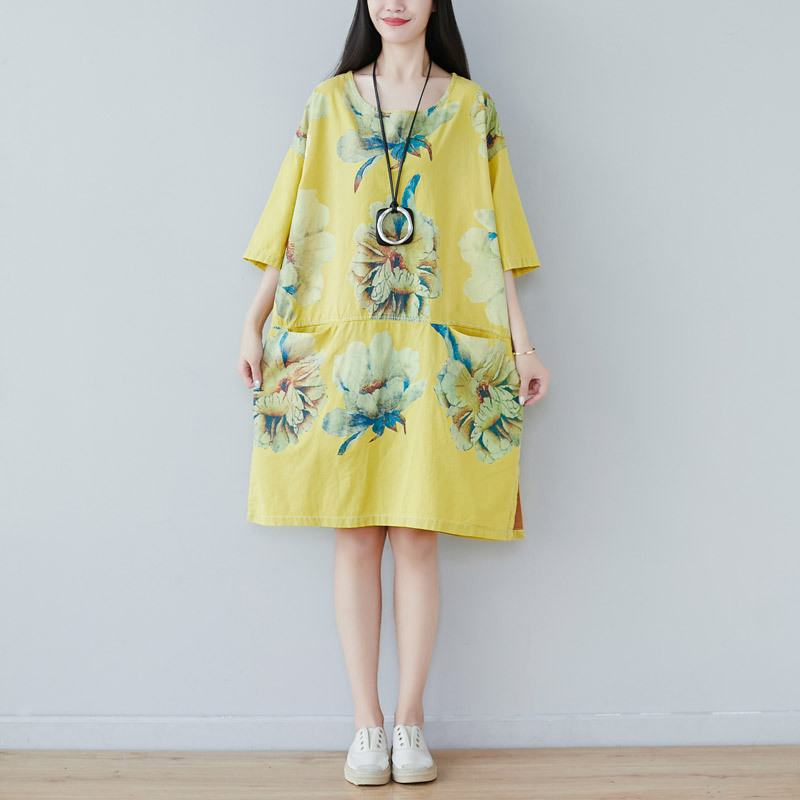 Gaya malas musim panas ukuran besar pakaian wanita gaun kasual pelangsing longgar retro kaus terbelah gaun wanita bisa dipakai di luar