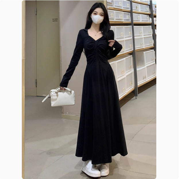 Gaun Gaya Hepburn Terlihat Langsing Gadis Gemuk Musim Gugur Selebriti Internet Rok Pakaian Wanita Gaya Perancis Baru Lengan Panjang Menutupi Perut Ukuran Besar 2024