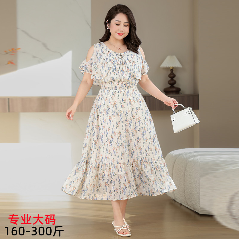Pakaian Wanita Ukuran Besar Gaun Bahu Terbuka Pinggiran Daun Teratai Sifon Model Baru Musim Panas Rok A-Line Di Bawah Lutut Model Setengah Panjang Wanita 8613