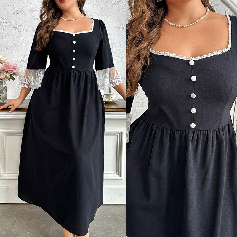 Produk Tersedia Gaun Lengan Busa Kerah Persegi Ukuran Besar Rok Panjang Sedang Terlihat Langsing Pinggang Tinggi Renda Sambungan Baru Musim Panas 2025 Wanita