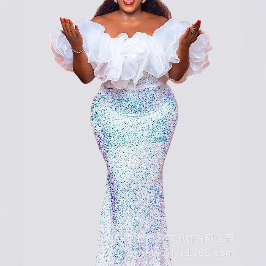 Cross-border khusus untuk gaun pelangsing pinggang tinggi berpayet dibalut organza seksi bahu terbuka Eropa dan Amerika baru