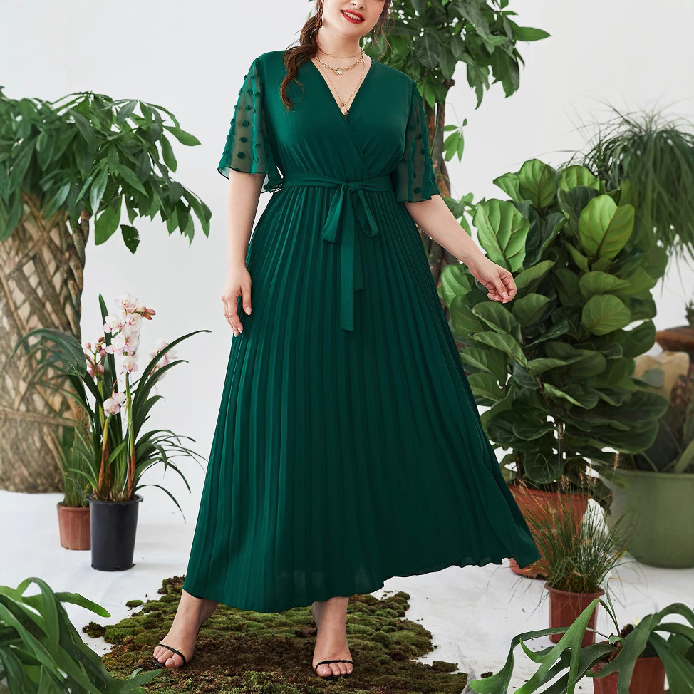 Spot Tersedia Gaun Lengan Pendek Kerah V Model Baru Musim Panas 2024 Rok Panjang Lipit Besar Bertali Pinggang Membentuk Pinggang Elegan Membentuk Tubuh Di Bawah Lutut