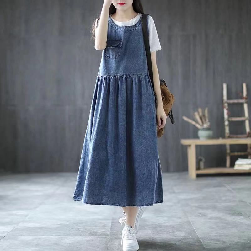 Rok suspender Denim, rok rompi tanpa lengan musim panas 2022, gaun longgar ukuran besar kerah V dalam panjang setengah