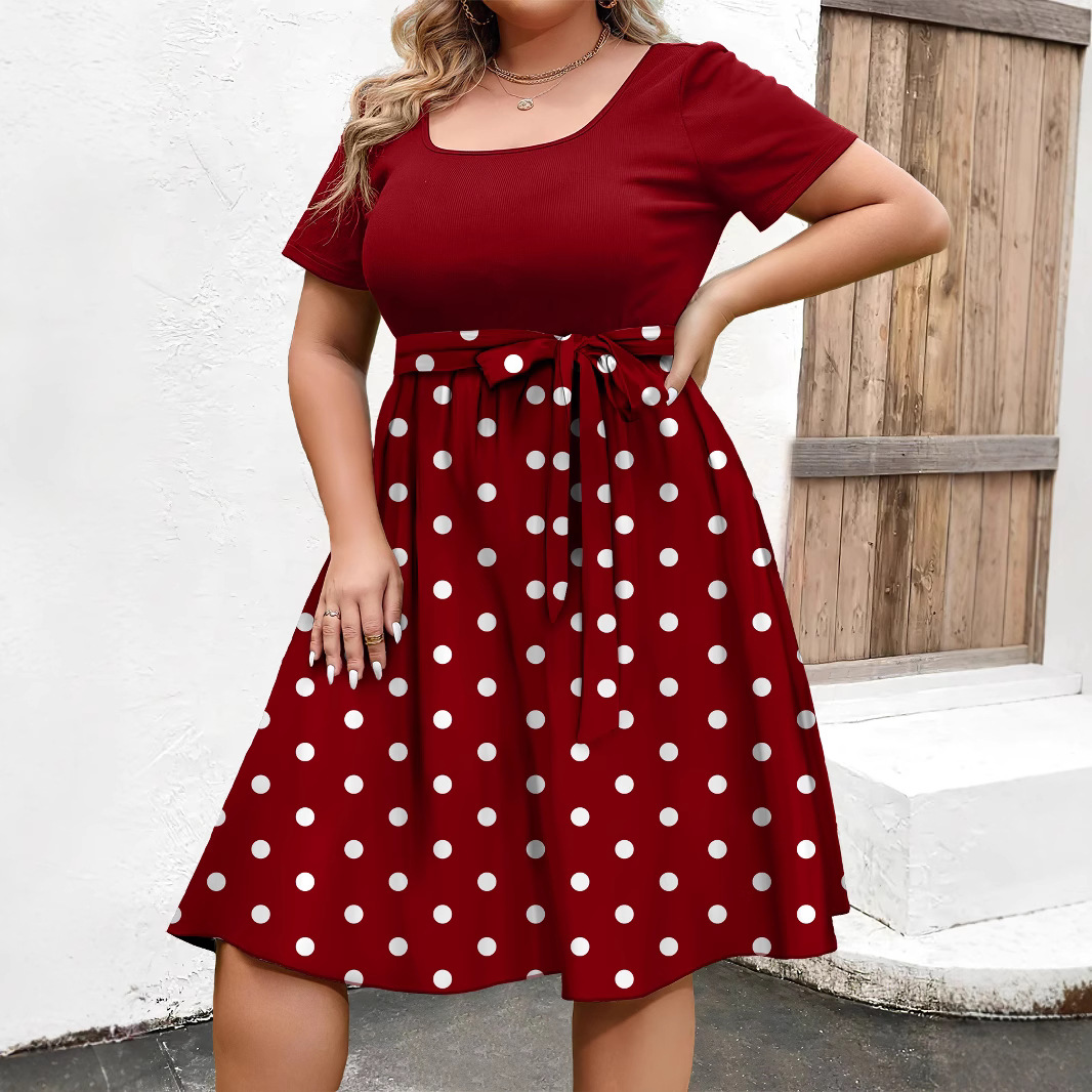 Gaun Kerah Persegi Mengurangi Usia Dot Warna Sensasi Dopamin Rok A-Line Terlihat Langsing Pinggang Ukuran Besar Wanita Gemuk 65368