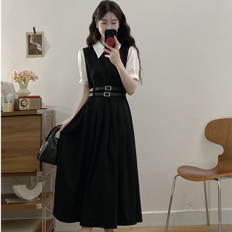 Gaun Lengan Pendek Retro Prancis Ukuran Besar Rok Hitam Kecil Elegan Gaya Hepburn Musim Panas Wanita Rok Terlihat Kurus Pelangsing Pinggang Wanita Gemuk