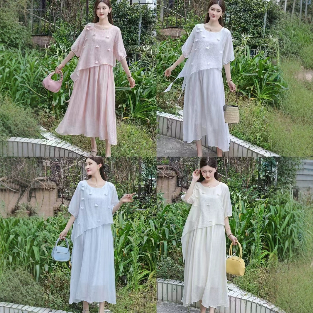 Gaun Dua Potong Palsu Rok Panjang Sedang Bunga Tiga Dimensi Longgar Terlihat Ramping Gaya Lembut Prancis Model Baru Musim Panas 2025 Wanita