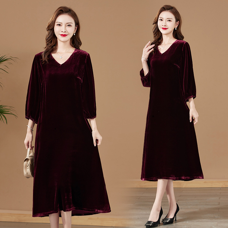 Penjualan langsung dari pabrik Hangzhou beludru asli gaun ukuran plus gaun ramping baru musim semi dan musim gugur gaun flocking sutra murbei untuk wanita
