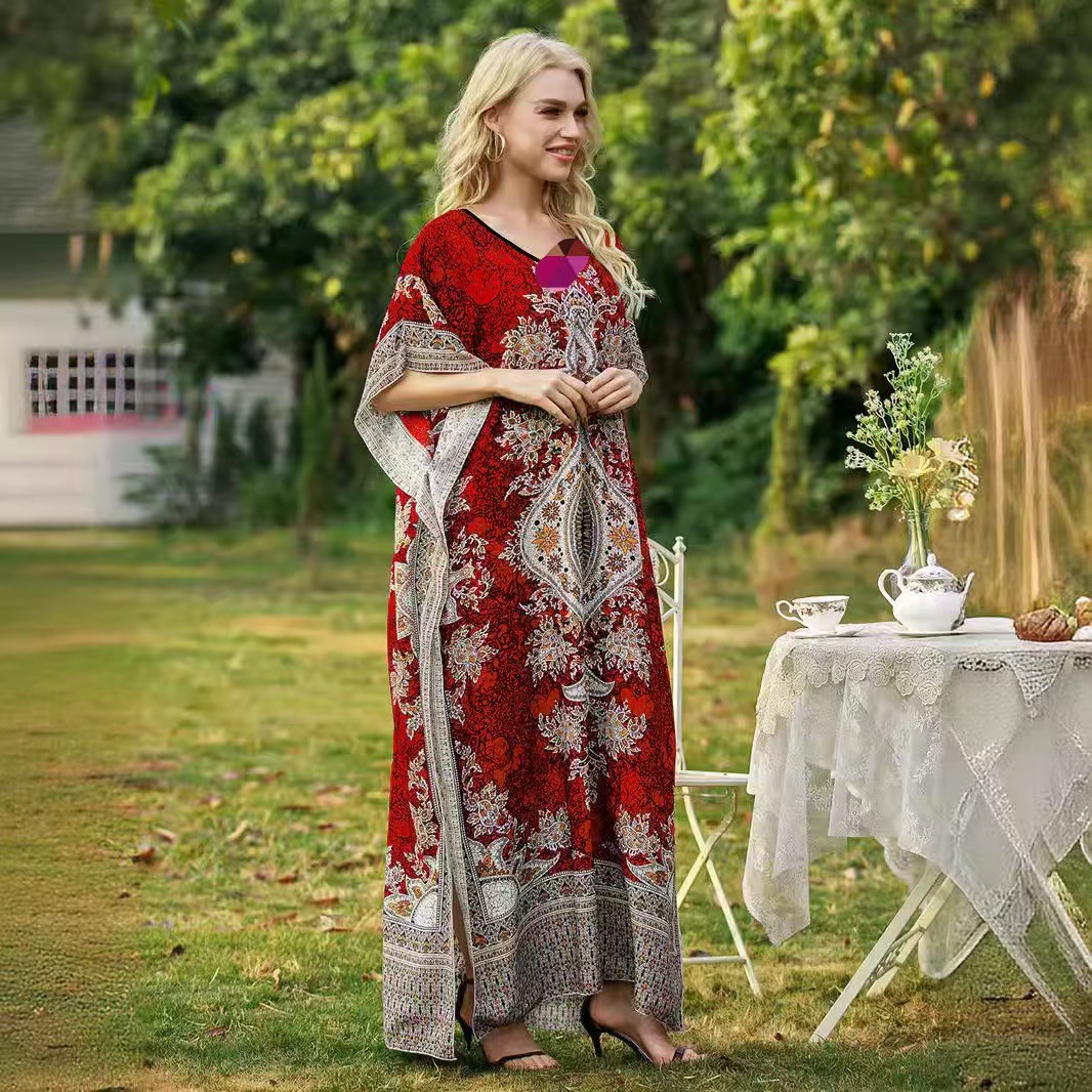 2025 Pakaian Wanita Eropa dan Amerika Model Baru Bercetak Rok Panjang Leher Bulat Longgar Ukuran Besar Gaun Liburan Pantai Sisi