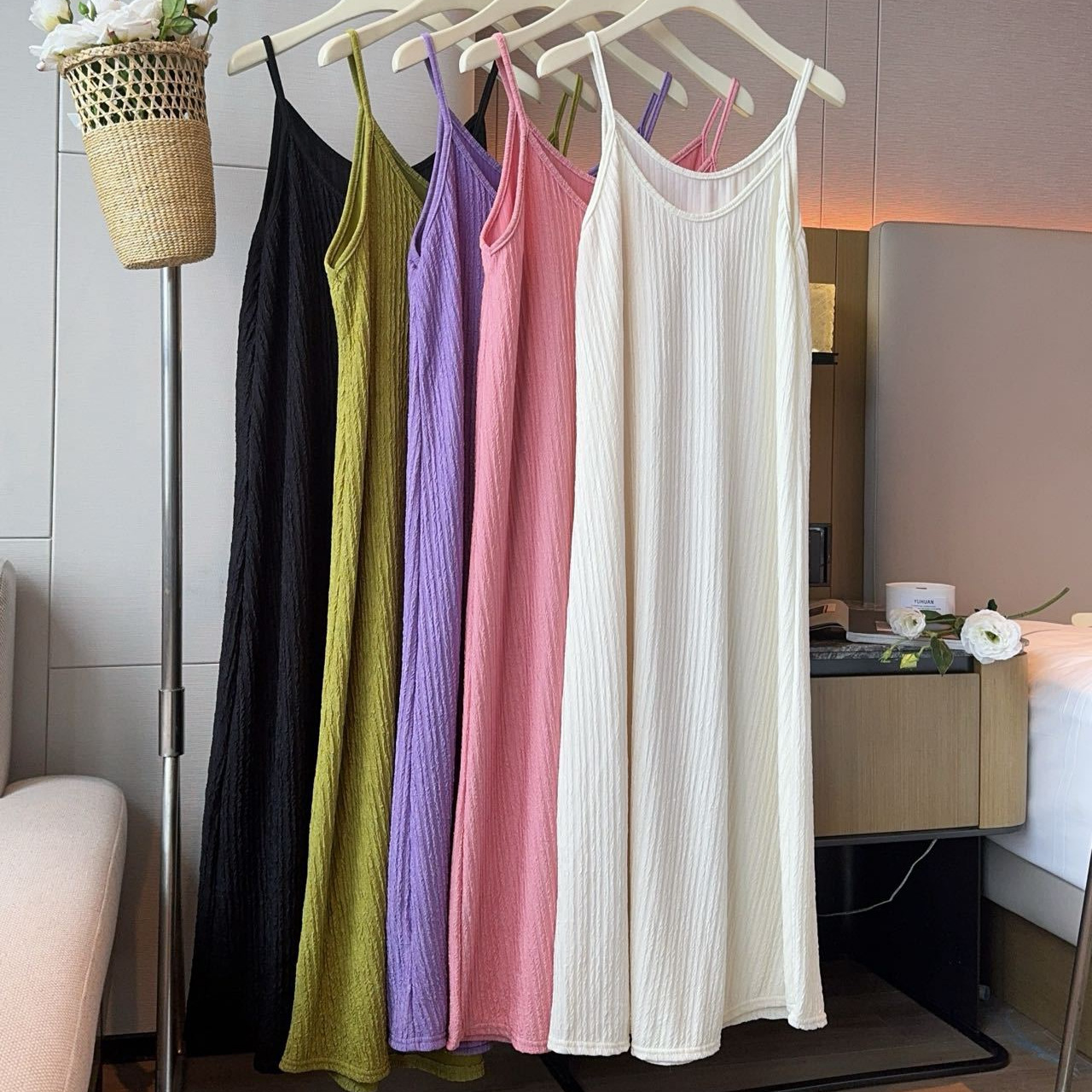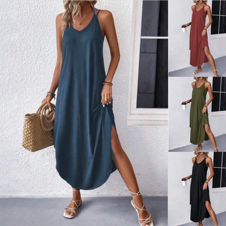 Wish diskon besar Amazon rok suspender seksi Eropa dan Amerika tanpa lengan warna solid longgar perdagangan luar negeri gaun ayun panjang besar